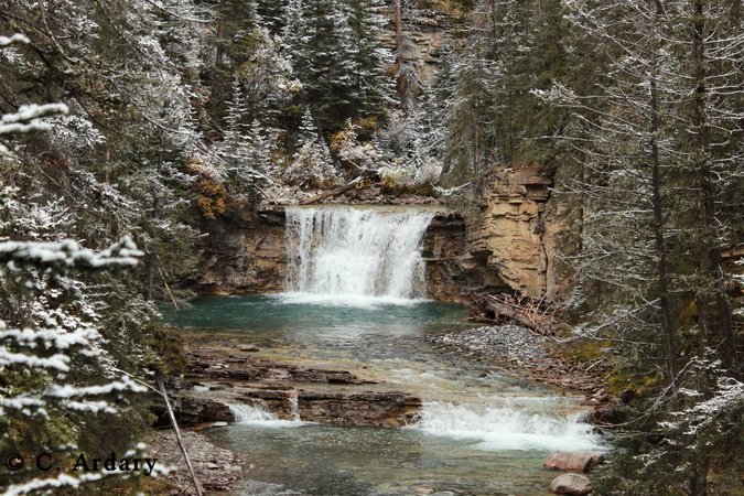 Johnston Creek (left photo) past the waterfalls, up and over a